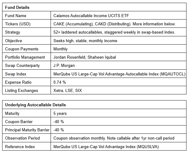 "Global investors have embraced structured notes for years while tolerating cumbersome over-the-counter access," said Matt Kaufman, SVP, Global Head of ETFs at Calamos. "Starting today, they can access a diversified portfolio of autocallables, continually refreshing over time, wrapped into a single-ticker ETF solution. This is a game changer."