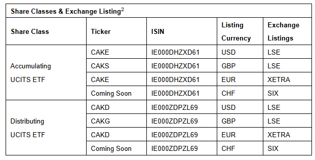 2 Anticipated listing dates: Xetra: April 27, 2026; LSE: April 28, 2026; SIX: May 2026; and additional UCITS mutual fund share classes (A, N and I) to follow.