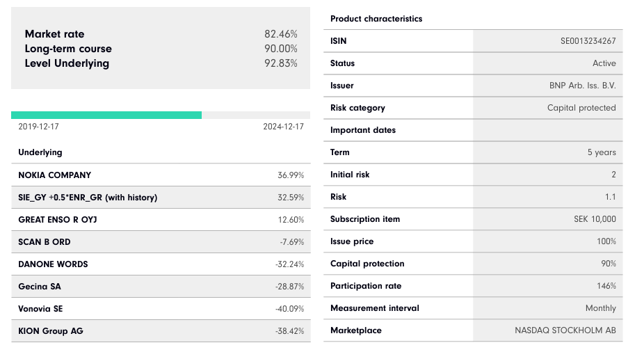 The product chosen for this case study is BNP AO Grön Hållbar SFB 90 3779 (ISIN: SE0013234267).