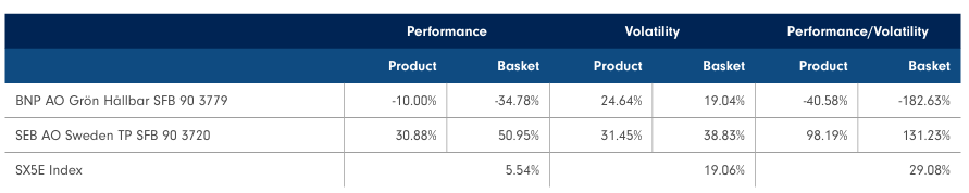 As seen from the performance charts, currently the ESG product is underperforming with a 10% loss, which is capped because of the 90% capital protection offered by the product. To further analyze some of the key performance indicators of the two products along with the Euro Stoxx Index as a reference, below are some the metrics that are taken into consideration: