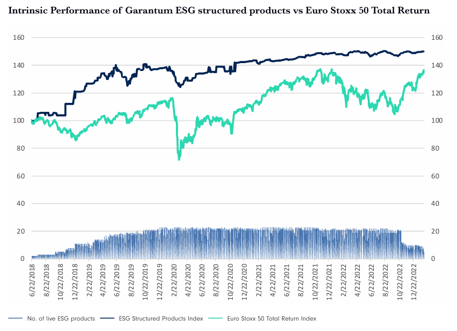 Over the past few years, the index has grown significantly, reaching its highest level with 22 live products. This growth can be attributed to the increasing demand for sustainable investments and the growing recognition of the importance of ESG factors in the investment process. The usage of structured products also allowed to lower the volatility of its intrinsic performance (instead of using the indicative prices from issuers compared with equity markets. Specially during the COVID bear market in February/March 2020.