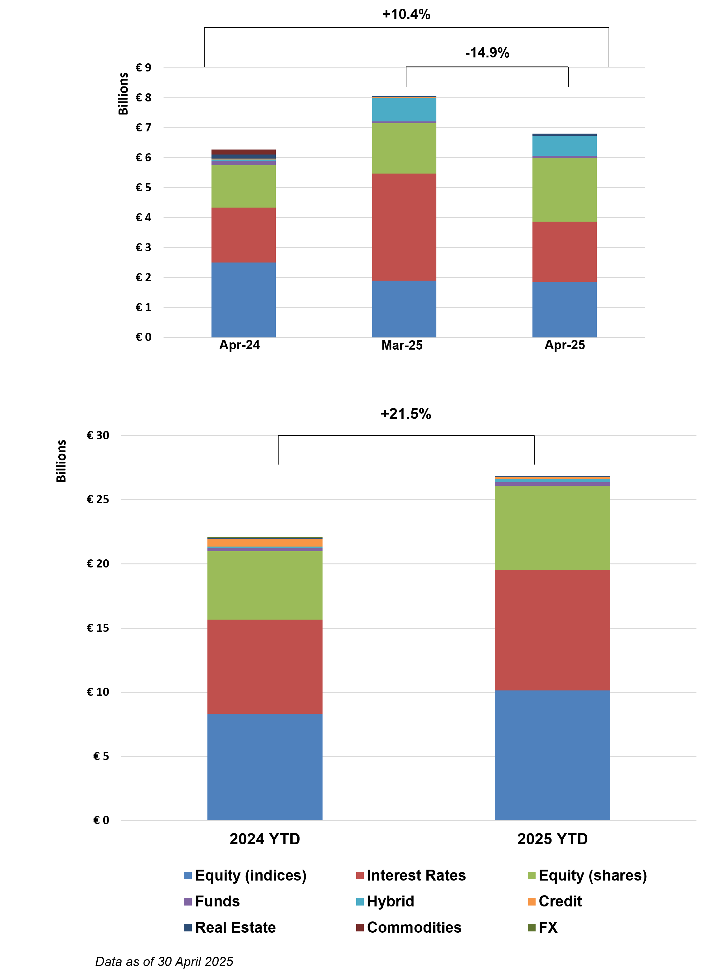 • Underlying Trends: Equity indices lead with ~38%, followed by rates (34.9%) and single stocks (24.5%), confirming balanced cross-asset allocation.