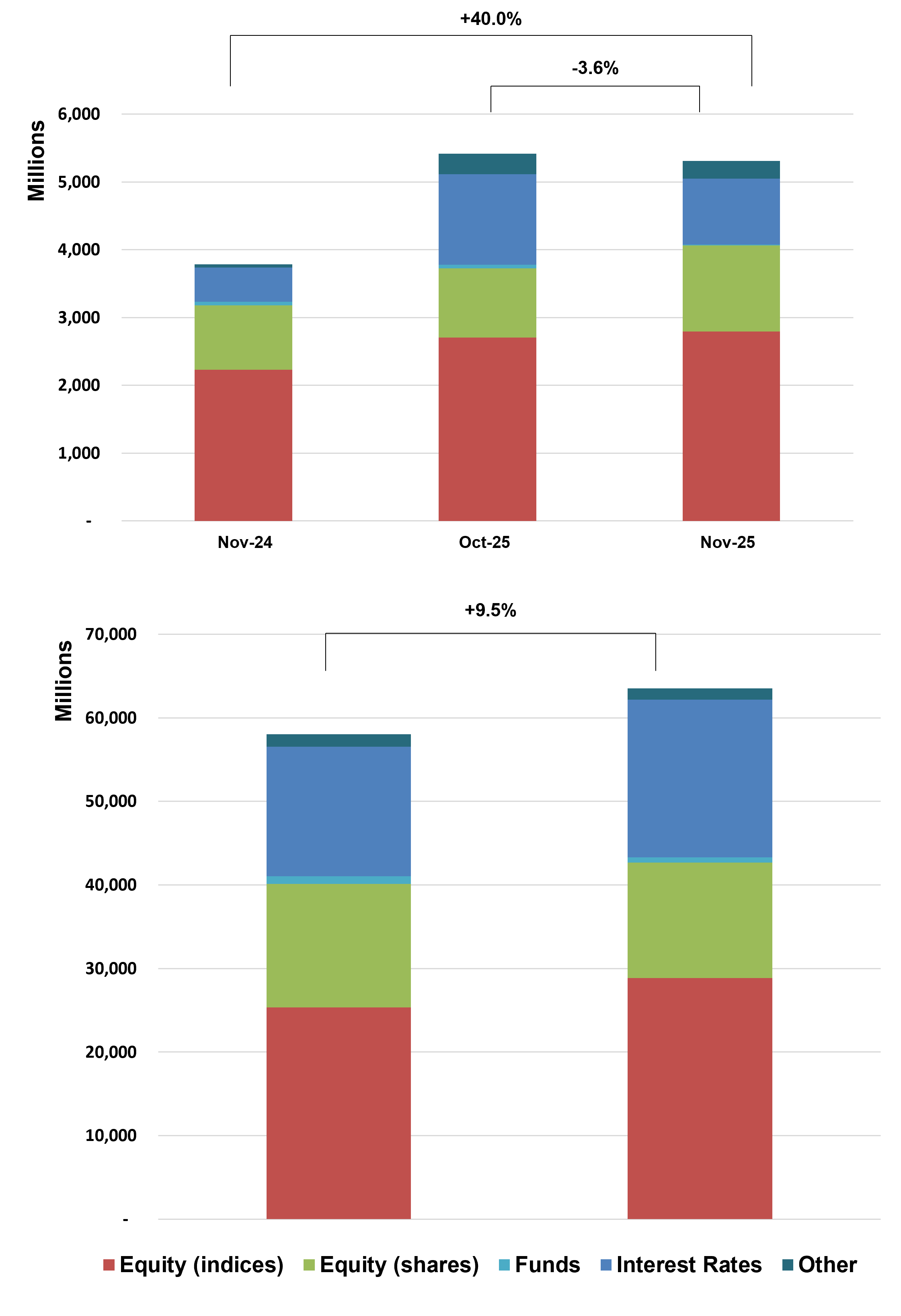• Underlying Trends: Equity indices reached EUR 28.8Bn (+13.9% YoY); rates EUR 18.9Bn (+21.6% YoY); single stocks EUR 13.8Bn (-6.7% YoY).
