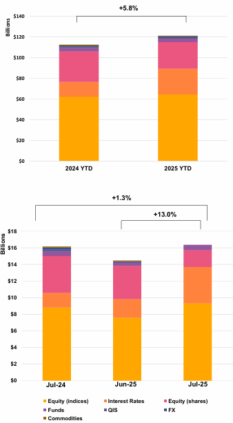 July data signals a renewed pickup in structured product activity, with issuance rising to USD 16.3Bn (+13% MoM) and pushing year-to-date volumes to USD 121.2Bn (+5.8% YoY). The rebound is largely driven by a sharp recovery in income products (USD 7.4Bn, +56% MoM), which have returned to Q1 levels, indicating a reacceleration in yield-seeking behavior. This is consistent with the sustained dominance of barrier phoenix structures (26.9%) and a stable share of knock-in products (43.7%), highlighting continued investor willingness to monetize volatility. At the same time, Growth products remain the core allocation (41.9%), supported by demand for barrier participation strategies. Structurally, the rebound in worst-of exposure (29.7%) suggests a renewed appetite for correlation risk, reversing the more cautious stance observed in Q2. Meanwhile, the persistent dominance of equity indices (53.2%), alongside balanced allocations to single stocks and rates, reflects a well-diversified underlying mix. Overall, the market appears to be re-entering a more constructive phase, with stronger issuance, revived income demand, and a gradual return to higher-yield structures.