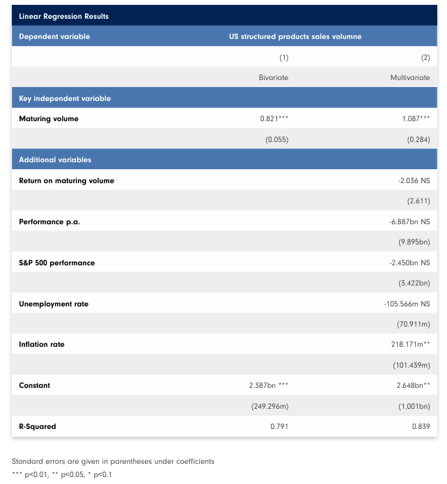 A regression analysis Although maturing and sales volume are extremely positively correlated in the US structured products market, we wanted to dig a little deeper and try to find some other factors that might explain such growth. To aid ourselves in this process, we developed a linear regression model to identify potential explainers of structured products sales volume in the US. Using the period between January 2017 and December 2021, we collected monthly data on maturing volume, the performance of US structured products, the S&P 500’s performance, the US unemployment rate and inflation. After running many different interactions to examine different variable combinations, we ended up with two regressions that can explain, to a very high degree, structured products sales in the US. The first model enabled us to achieve a coefficient of determination of 79% using only the total volume of maturing structured products in the US as an independent variable. In other words, 79% of the variation in structured products sales volume can be explained by the variation in the volume of maturing structured products. This means that when we conduct just a simple linear regression of structured products sales volume on maturing volume, our model already does a pretty good job of explaining the correlation between sales and maturing volume (and does so with a highly statistically significant coefficient on maturing volume). This result suggests that a major determinant of structured products sales volume is the re-investment and roll-over of previous investments in structured products. We also find out that the equity performance, such as the S&P 500, or the unemployment rate, do not explain the sales of structured products.