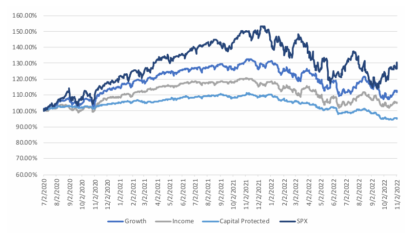 To further analyse structured products, we categorized them into three types: capital protected, growth, and income. By doing so, we were able to group together products with similar levels of risk and create indices for each category to analyse their value. We used the indicative prices of 17 issuers of products distributed in the US market between July 2020 and November 2022 to calculate the indices. Any product that had at least 100% capital guaranteed, we categorise those as capital protected products, while we split the remaining products as Income if they had regular payments (fixed or contingent), while the remaining products were considered growth.