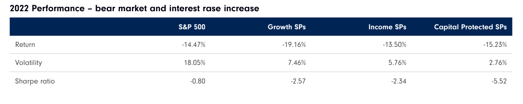 However, in 2022, a bear market and increasing interest rates led to a decline in the performance of all four indices. The S&P 500 index delivered a negative return of -14.47%, while the Growth SPs index recorded the lowest return of -19.16%. The Income SPs index and Capital Protected SPs index recorded negative returns of -13.50% and -15.23%, respectively.